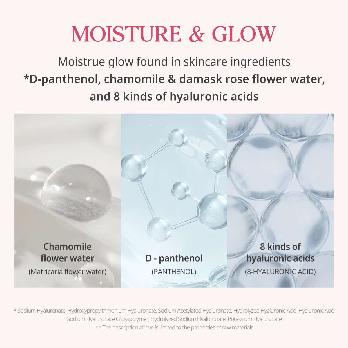 Enriched with rose water, chamomile, and 8 types of hyaluronic acid to hydrate, soothe, and calm your skin. -